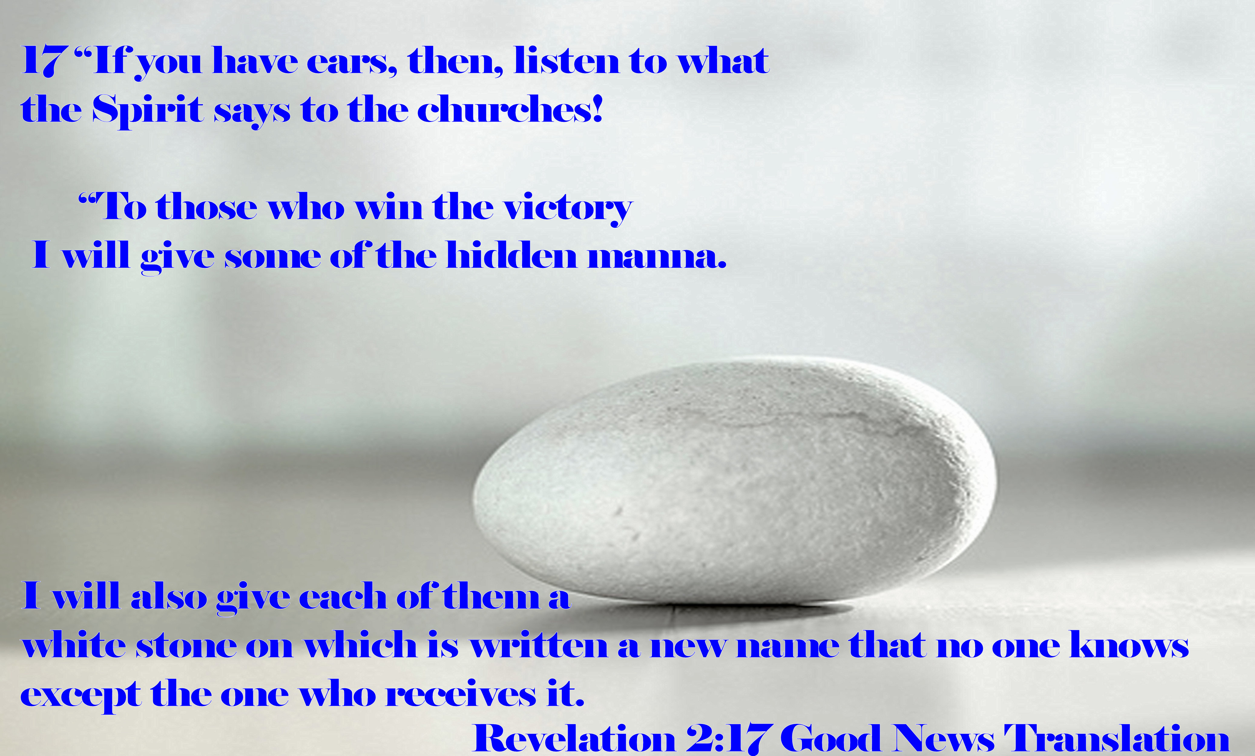 “He who has an ear, let him hear what the Spirit says to the churches. To him who overcomes I will give some of the hidden manna to eat. And I will give him a white pebble, and on the stone a new name written which no one knows except him who receives it.”